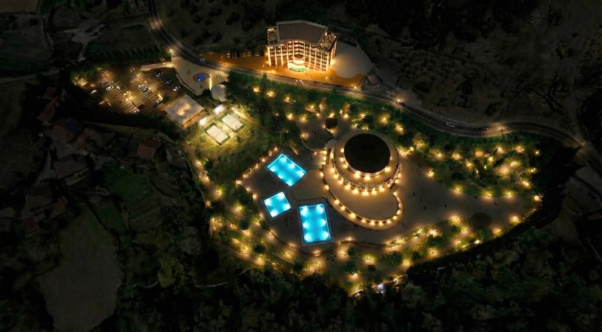 Le prime immagini progettuali delineano una profonda riqualificazione dell’area, pensata come un moderno polo dedicato al benessere e all’ospitalità. Al centro del progetto emerge un edificio principale dalla forma circolare, destinato a diventare il fulcro delle attività, attorno al quale si sviluppano percorsi, servizi e spazi aperti. Accanto a questo, è prevista una struttura alberghiera autonoma ma integrata, collocata lungo la viabilità principale.