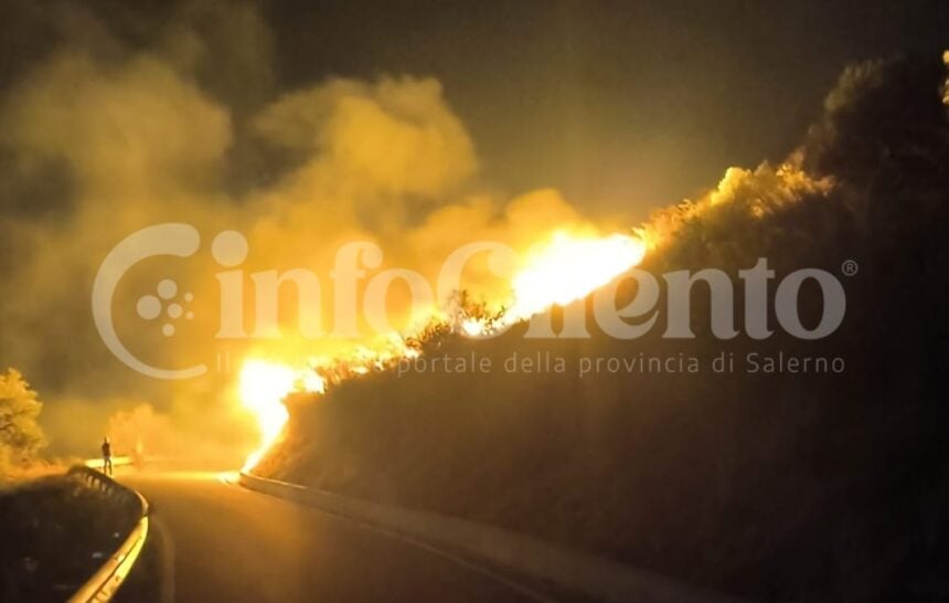 Un violento incendio è divampato questa sera in località Scavi, lungo via San Nicola a Castelnuovo Cilento, la strada che conduce al capoluogo comunale.